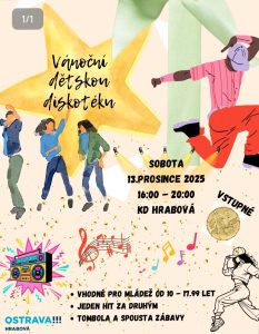 Komise pro děti a mládež by ráda pozvala všechnu mládež od 10 do 17,99 let na poslední hrabovskou diskotéku v tomto roce, konanou dne 13.12. 2025 od 16:00 do 20:30 hodin v kulturním domě.