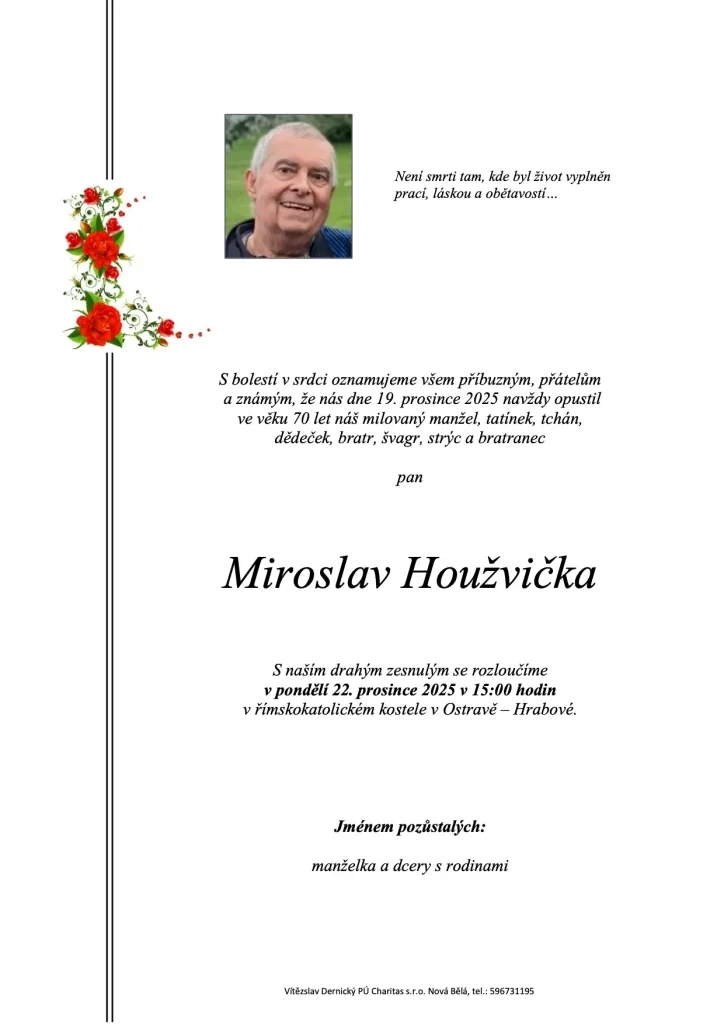Mirek Houžvička si přál, aby se jeho pohřeb stal oslavou jeho života, nikoli smutným loučením. Prosíme proto všechny, kteří se s ním přijdou rozloučit a vzdát mu poctu, aby nevolili černé oblečení ani tmavé stuhy.