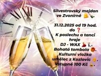 Přijďte oslavit konec roku na Silvestrovský mejdan ve Zvonírně! Akce se koná ve středu 31.12. 2025 od 19 hodin. O hudbu k tanci a poslechu se postará DJ WAX. Program zahrnuje také bohatou tombolu a speciální kulturní vložku s umělcem z Kozlovic.