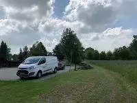 Před kostelíkem sv. Kateřiny v Ostravě-Hrabové právě budují Ostravské komunikace veřejné osvětlení. Podle nepotvrzených informací se jedná o dva sloupy veřejného osvětlení na ulici Na Zvoničce.