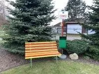 Historická tramvaj se dočkala své vlastní opravdové stanice. Lavička s odpadkovým košem a cedulí, stejně jako samotná tramvaj, se nachází na pozemku Jana Kohoutka, který ji tam „vytvořil“ včera večer…