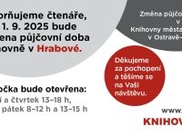 Po mnoha letech dochází od 1. září 2025 ke změně půjčovní doby v knihovně v Hrabové. Důvodem je sjednocení provozní doby na podobně velkých pobočkách Knihovny města Ostravy.