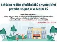Vážení rodiče předškoláků, srdečně Vás tímto zveme na rodičovskou schůzku s učiteli prvního stupně a vedením Základní školy v Ostravě-Hrabové, která se uskuteční ve čtvrtek 31.3. 2022 v 15:30 hod. v jídelně základní školy. POZOR! Původně byla v pozvánce uvedena jídelna mateřské školy.